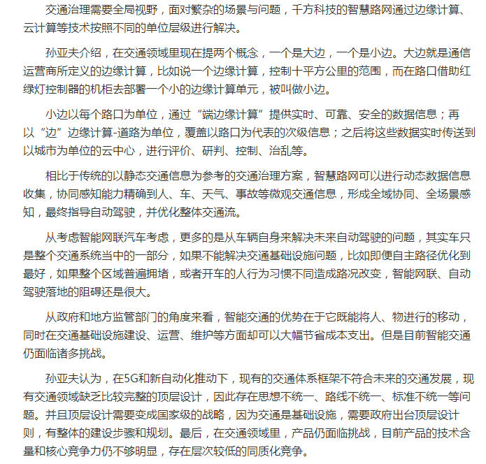 “以前,智能交通领域寄希望于让前端单个设备提升算力,而5G时代,广泛的前端设备实现了计算力的全面连接与覆盖,场景感知力的综合提升让智能交通系统变得更加及时、智能,这时我们知道,新一代智慧路网正在形成。”千方副总裁、技术研究院院长孙亚夫在云栖大会现场如是说。
